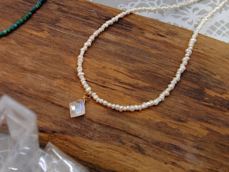 チョーカーは白と黒の2タイプが入荷し、白タイプは淡水パールとブルームーンストーン、黒タイプはブラックスピネルとレインボームーンストーンで、いずれも天然素材の良さが引き立つ作品となっています。